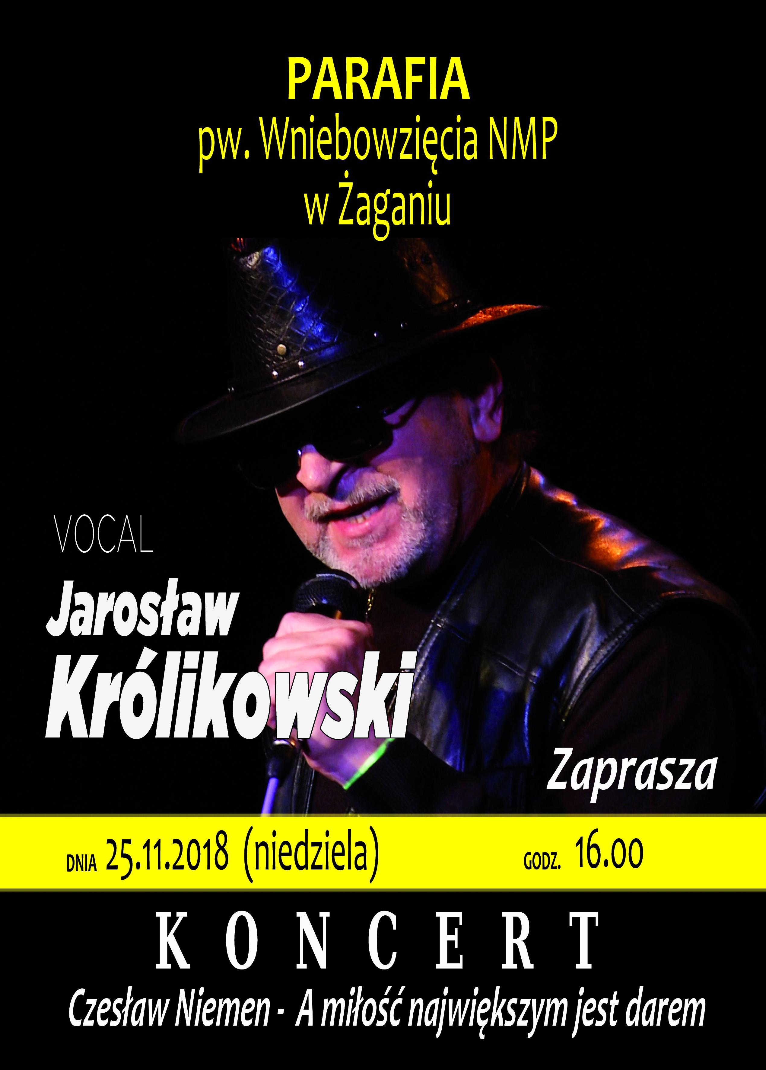 Parafia pw. Wniebowzięcia NMP w Żaganiu serdecznie zaprasza wszystkich mieszkańców 25 listopada o godz. 16.00 na wyjątkowy koncert pt. “Czesław Niemen – A miłość największym jest darem”. Zaśpiewa dla Państwa Jarosław Królikowski. Wstęp wolny.
