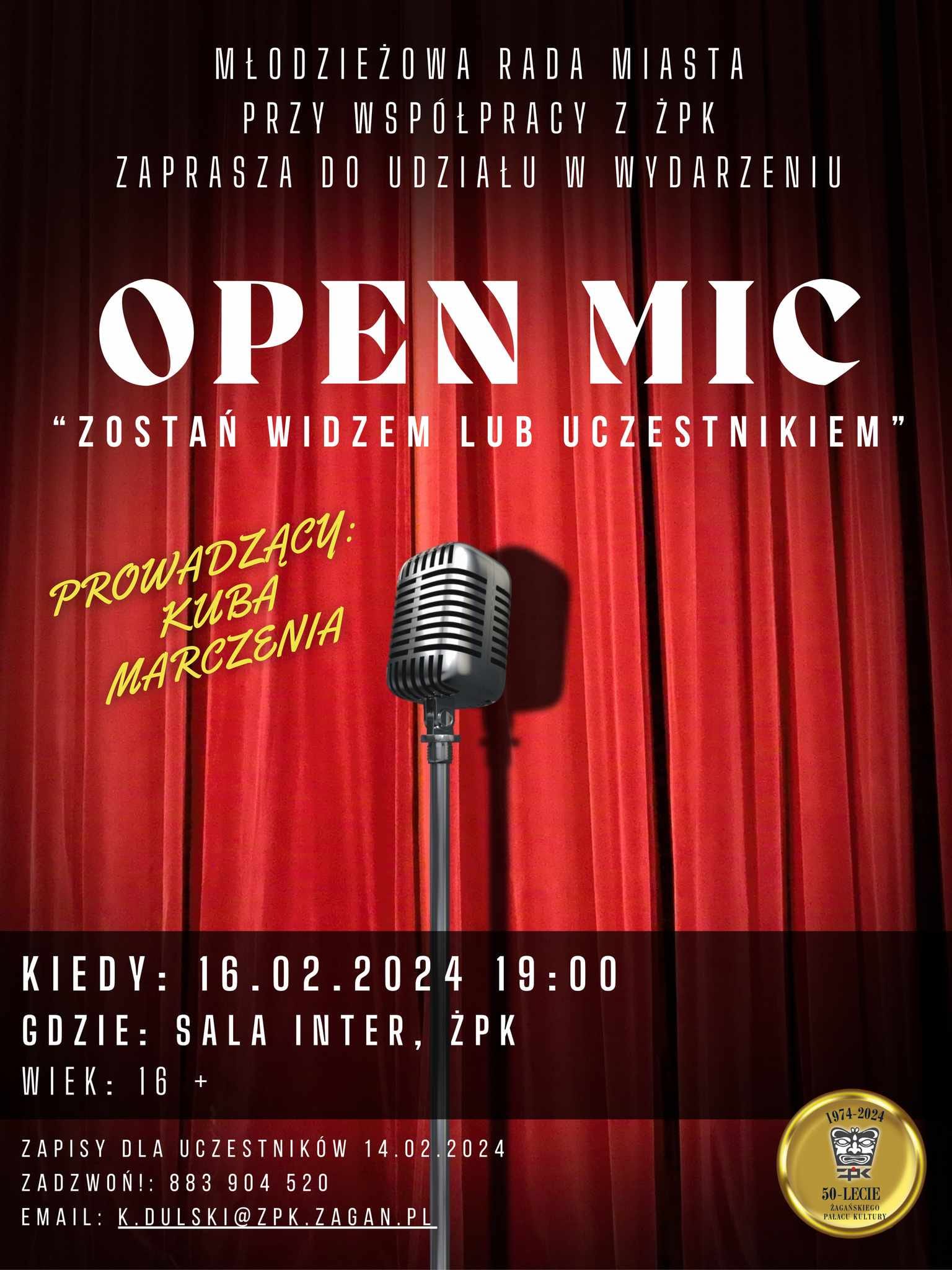 Przygotowując tegoroczną ofertę feryjną dla młodzieży rozmawiamy z Młodzieżowa Rada Miasta Żagań. Jednym ze zgłoszonych pomysłów na organizację przerwy zimowej było przygotowanie otwartej sceny dla miłośników stand-up! Zapraszamy każdego, kto chce spróbować swoich sił w show biznesie oraz każdego, kogo bawi zabawa słowem do pałacu na Pierwszy Żagański Open Mic!
