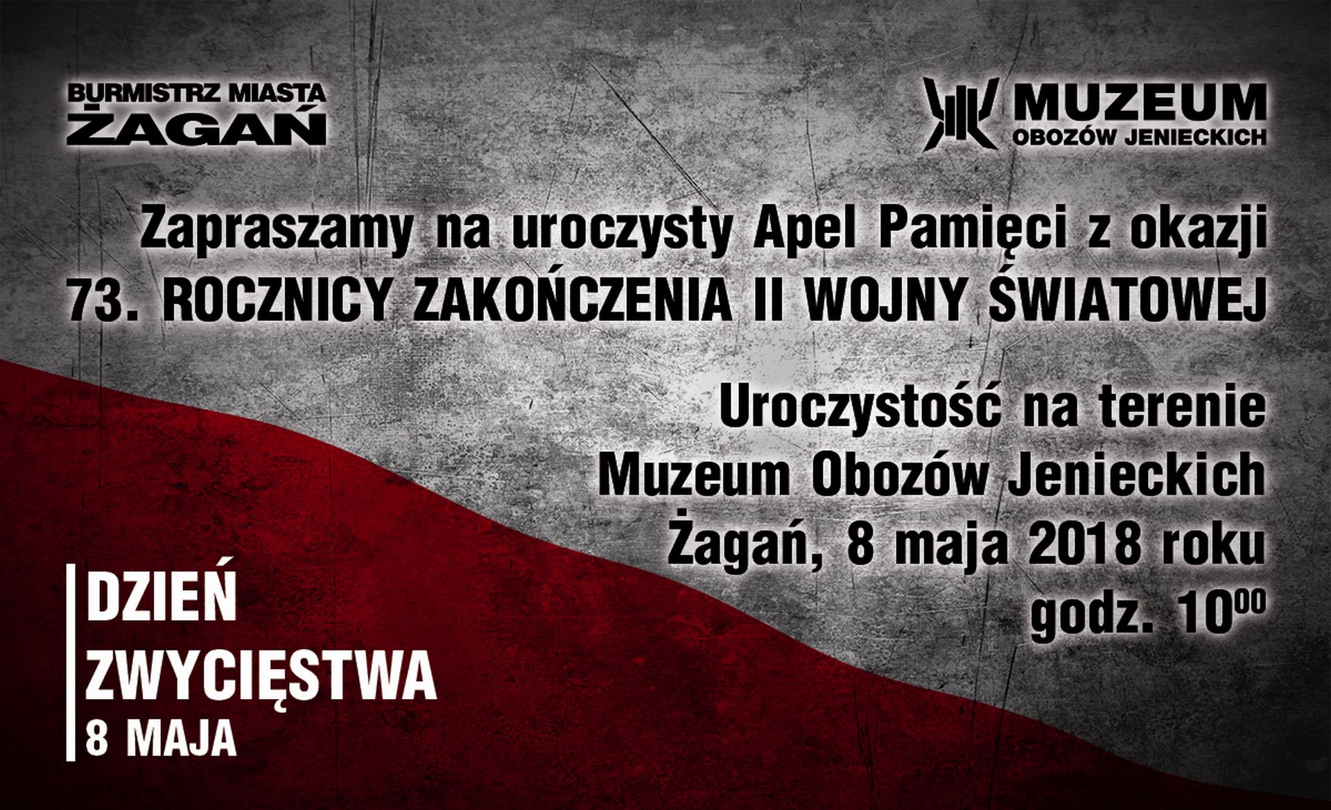 8 maja 2018 roku zapraszamy na uroczystość z okazji Dnia Zwycięstwa. O godz. 10:00 na terenie Muzeum Obozów Jenieckich w Żaganiu odczytany zostanie Apel Pamięci oraz złożone zostaną kwiaty pod Pomnikiem Ofiar Stalagu VIIIC.
