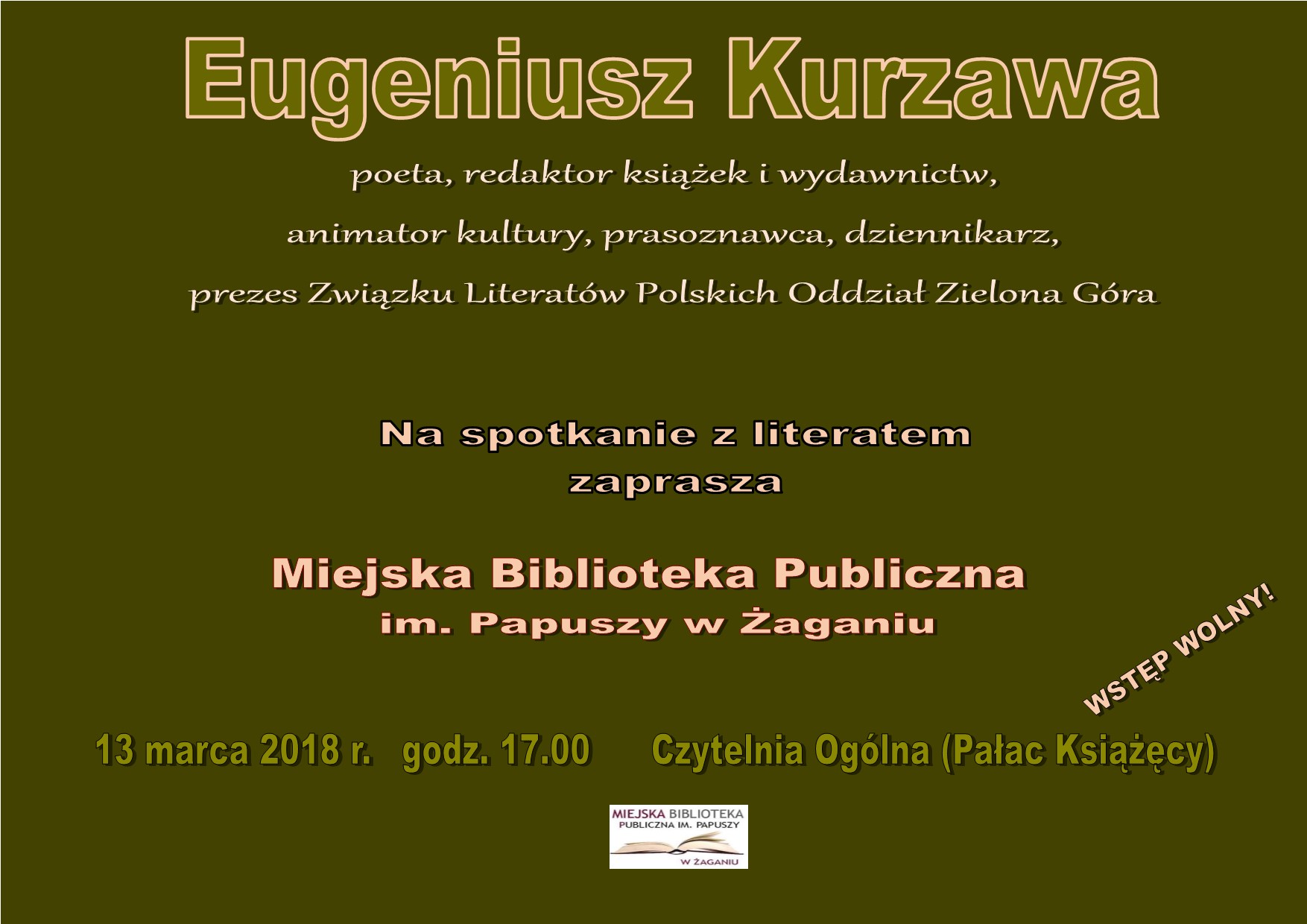 13 marca 2018 roku zapraszamy na spotkanie z Eugeniuszem Kurzawą, poetą, dziennikarzem, redaktorem książek, prasoznawcą i animatorem kultury oraz prezesem zielonogórskiego oddziału Związku Literatów Polskich. Spotkajmy się o godzinie 17.00 w Miejskiej Bibliotece Publicznej (Czytelnia Ogólna).