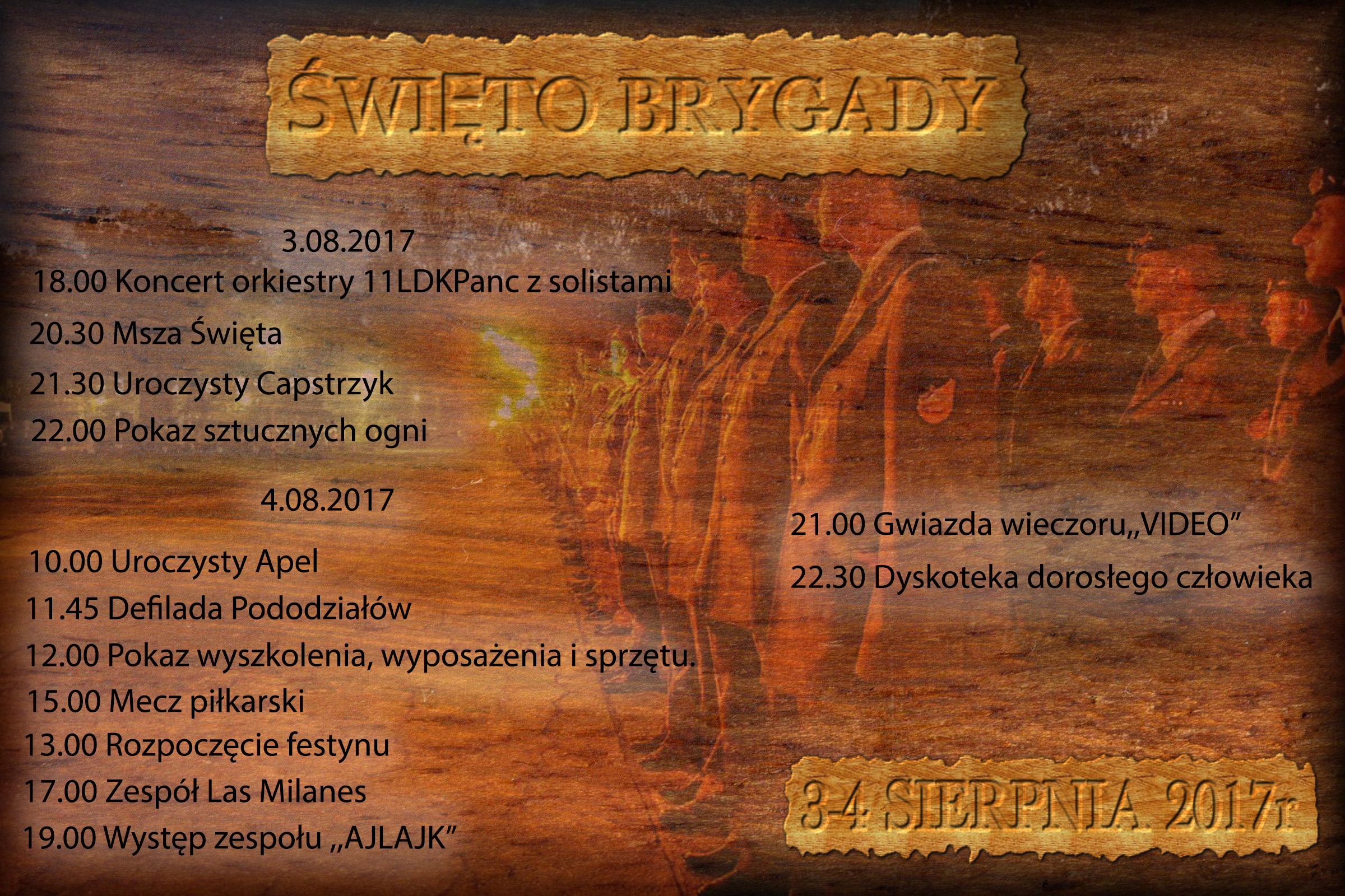 W czwartek 3 sierpnia o godz. 18.00 uroczystym koncertem orkiestry wojskowej z Żagania rozpocznie się dwudniowe święto 10. BKPanc. 20.30 msza święta, 21.30 capstrzyk, 22.00 pokaz sztucznych ogni.