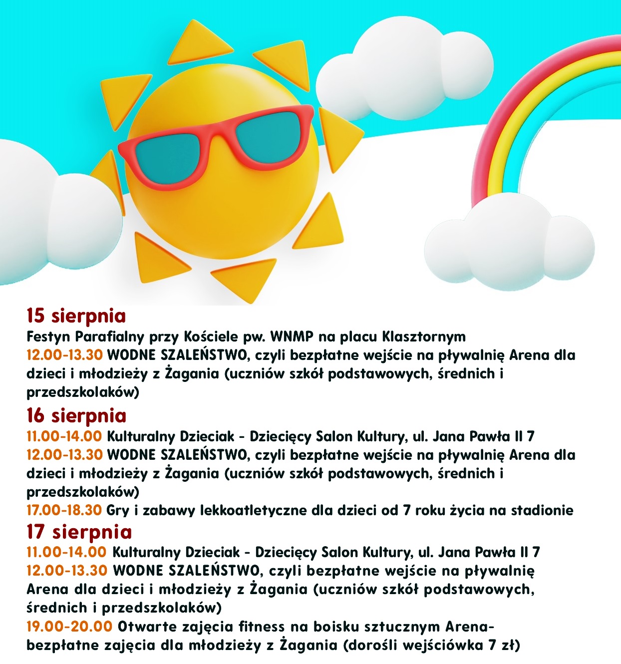 12.00-13.30 WODNE SZALEŃSTWO, czyli bezpłatne wejście na pływalnię Arena dla dzieci i młodzieży z Żagania (uczniów szkół podstawowych, średnich i przedszkolaków), limit wejść – 40 osób