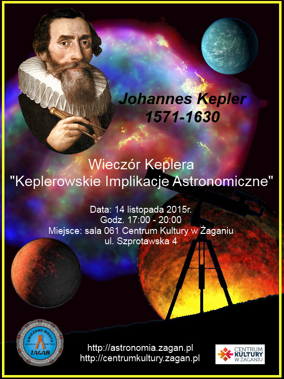 14 listopada 2015 roku w godzinach od 17:00 do 20:00 zapraszamy do sali 061 żagańskiego Pałacu Książęcego na Wieczór z Keplerem. Spotkanie rozpocznie prelekcja “Keplerowskie Implikacje Astronomiczne” przygotowana przez Jacka Patka, następnie zapraszamy do obejrzenia prezentacji działań Sekcji Astronomicznej Szkoły Talentów Centrum Kultury w Żaganiu oraz dyskusji. Wieczór zakończy obserwacja Wielkiej Mgławicy Andromeda – obserwatorów zapraszamy na taras oranżerii Pałacu Książęcego.