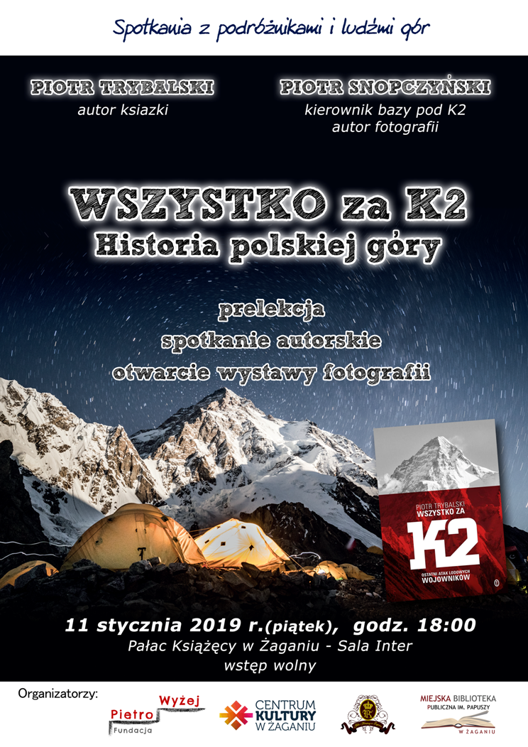 Fundacja Piętro Wyżej, Centrum Kultury w Żaganiu, Miejska Biblioteka Publiczna im. Papuszy oraz Pałac Książęcy sp. z o.o. zapraszają w piątek 11 stycznia na wyjątkowe wydarzenie w żagańskim pałacu – prelekcję “Wszystko za K2. Opowieść o polskiej górze”, połączoną z otwarciem wystawy kierownika bazy pod K2 zimą 2017/2018 “Wyprawa” oraz spotkanie autorskie z Piotrem Trybalskim “Wszystko za K2. Ostatni atak lodowych wojowników”. Prelekcja rozpocznie się o godzinie 18.00 w Sali Inter Pałacu Książęcego. Wstęp wolny.