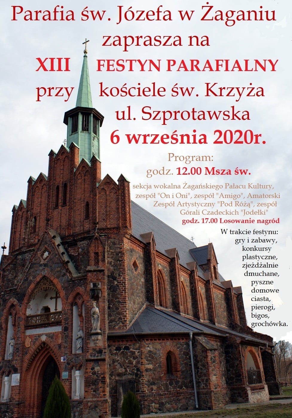 Parafia św. Józefa w Żaganiu zaprasza 6 września 2020 roku na XIII Festyn Parafialny przy kościele Świętego Krzyża przy ulicy Szprotawskiej.
