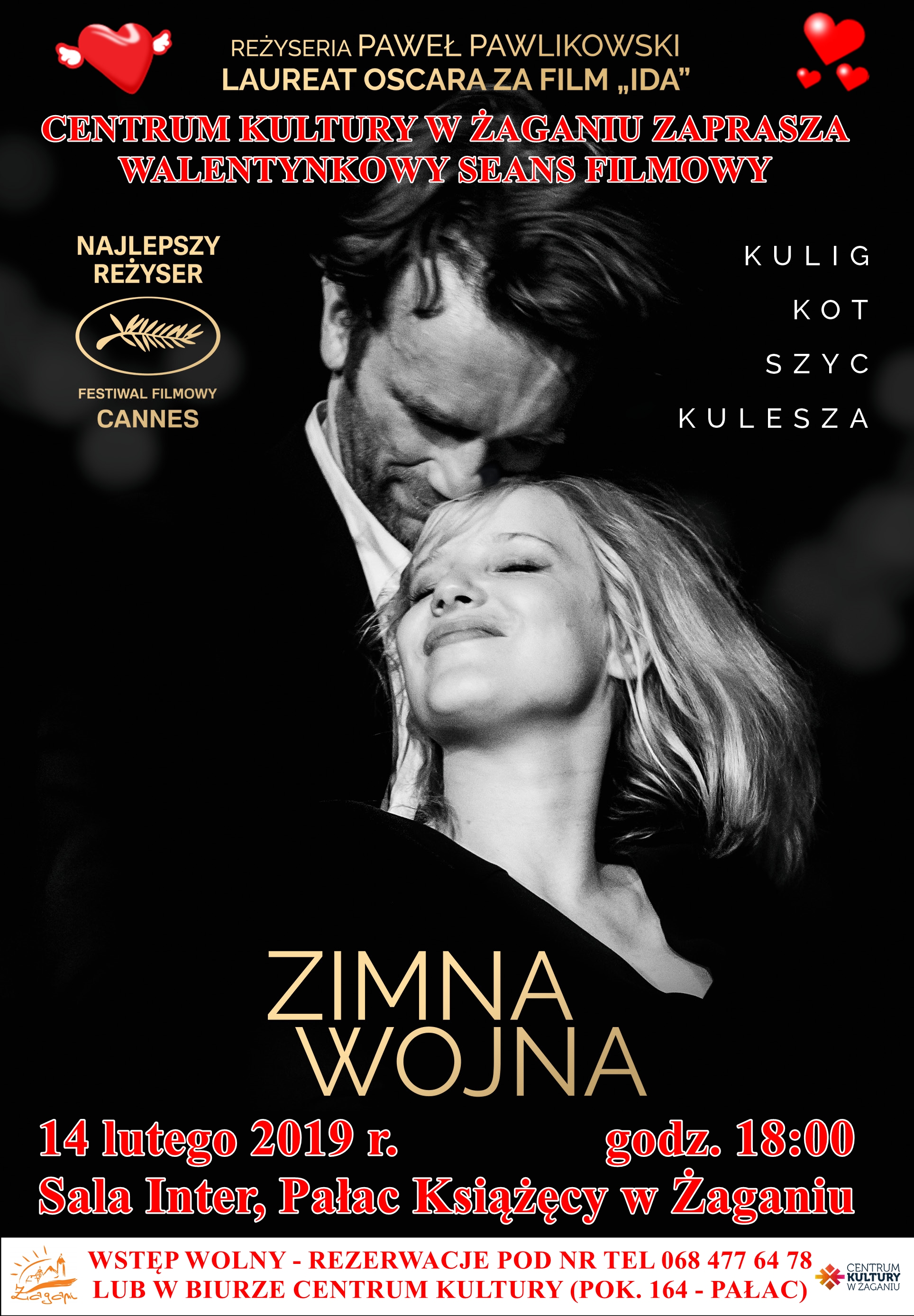 14 lutego o godz.18:00 w sali Inter Pałacu zapraszamy na filmowy seans „Zimna Wojna” (3 nominacje do Oscarów 2019). Wstęp na projekcję jest wolny, ale z uwagi na ograniczoną ilość miejsc obowiązują rezerwacje telefoniczne (68 477 64 78) lub w biurze Centrum Kultury (pok.164 Pałac).