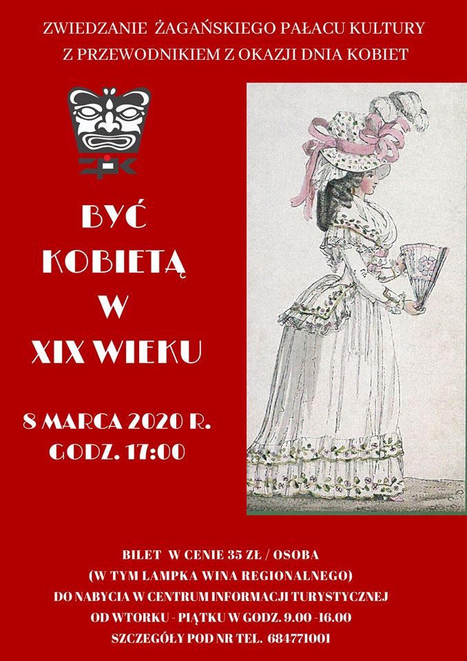 Kolejna propozycja z okazji Dnia Kobiet – zapraszamy nie tylko Panie na zwiedzanie Żagańskiego Pałacu Kultury z przewodnikiem w duchu epoki. Spotkanie odbędzie się pod szyldem ,,Być kobietą w XIX wieku”, a zakończy je degustacja lokalnego wina.